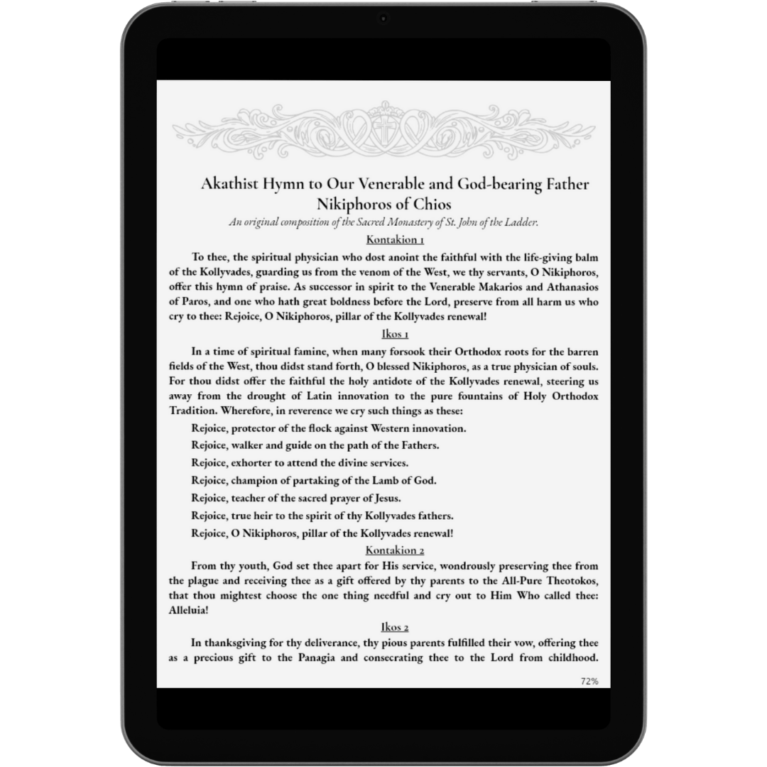 - An Original Akathist Hymn to St. Nikiphoros: Composed with prayer by our monastery, The Sacred Monastery of St. John of the Ladder, this beautiful and moving Akathist is written specifically for True Orthodox Church usage. It extols the saint as a “pillar of the Kollyvades renewal” and a “protector of the flock against Western innovation,” asking for his prayers to help us remain steadfast in the Faith of our Fathers.