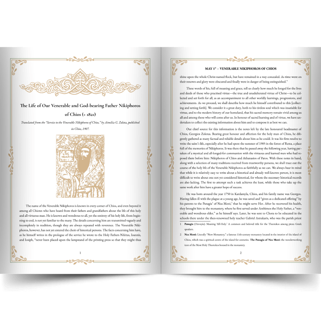 - The Life of St. Nikiphoros of Chios: An original and exclusive English translation of the saint’s life, taken from the 1907 Greek publication by Aimilia G. Zolota. Journey with St. Nikiphoros from his miraculous healing as a child, through his service at Nea Moni, his tireless work preserving the lives of the New Martyrs in the New Leimonarion, and his quiet, wonderworking life of prayer at Resta.