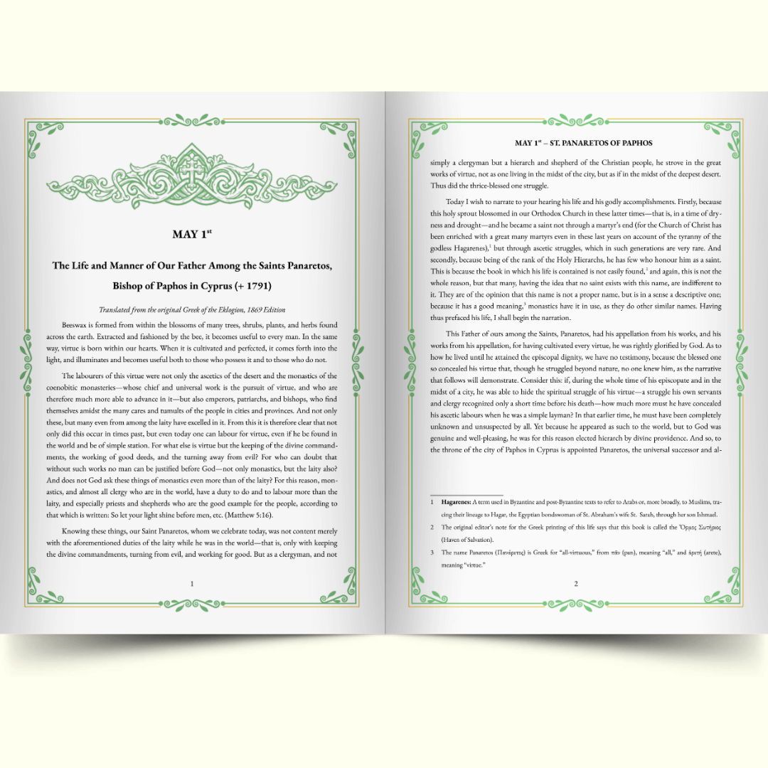 • The Life of St. Panaretos of Paphos: An original and faithful English translation of the saint’s life from the rare 1869 Greek Eklogion. Witness his secret struggles, his astonishing miracles, his prophetic foresight, and the divine revelations that glorified him at his blessed repose.